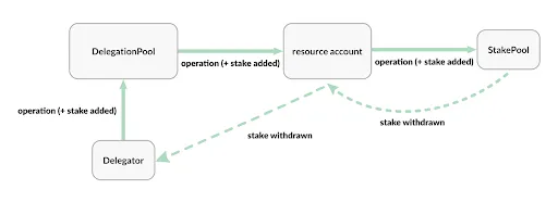 Unlike a stake pool, a delegation pool can be initialized with zero stake. When initialized, the delegated stake pool is owned indirectly via a resource account. This account will manage the stake of the underlying stake pool on behalf of the delegators by forwarding their stake-management operations to it (add, unlock, reactivate, withdraw) while the resource account cannot be directly accessed nor externally owned.